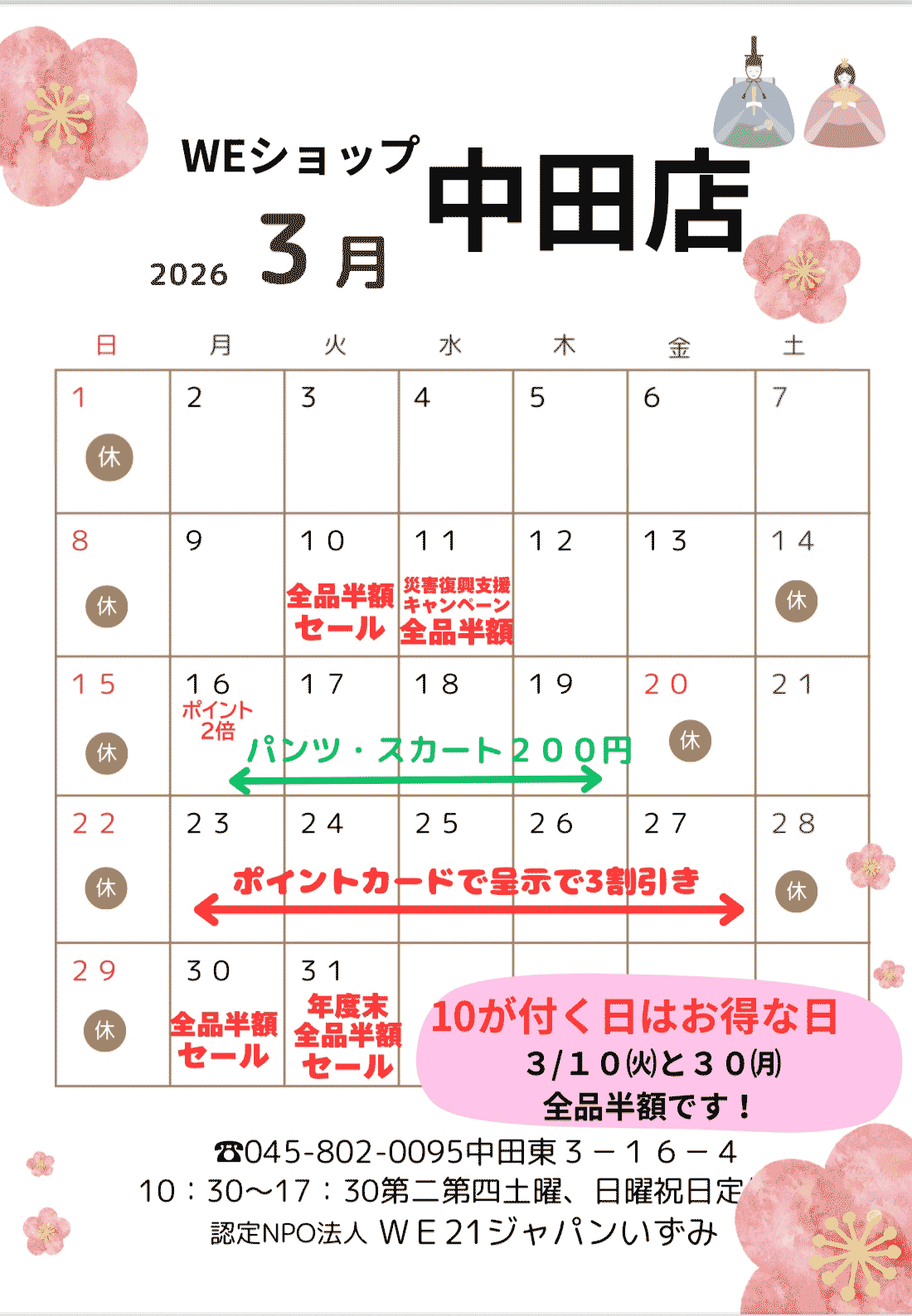 今年も3.11半額セール(3/11)と店内募金(3/2〜31)、